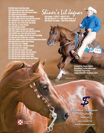LTE: $15,000. OE: $ 16,000. AQHA Superior Reining Horse; AQHA Open Reining Points 141; AQHA Am Reining Points 65; Produce AQHA Points 80 2006 NRHA Futurity Limited Open Finalist 2006 CPRHA Sandhills Slide Sire Stakes Open Futurity Champion 2006 MRHA Autumn Slide Open Futurity Champion 2007 CPRHA Open Reining Champion 2007 CPRHA Sandhills Slide Open Derby Champion 2007 AQHA World Show Qualifier 2008 CPRHA Open Champion 2008 CPRHA Sandhills Slide Open Derby Champion 2008 AQHA Reserve Champion Honor Roll Open Reining 2011 CPRHA Great Plains Futurity & Derby 7&up Open Derby Champion 2011 AQHA World Show Qualifier Open Reining 2012 CPRHA Rookie Level 2 Champion 2012 AQHA Amateur Qualifier Amateur Reining 2012 NRHA North America Affiliate Finals Qualifier 2012 AQHA Open World Show Qualifier Sr Reining / Ranch Pleasure 2012 AQHA ROM Amateur Reining 2013 AQHA Amateur Reining / Ranch Pleasure