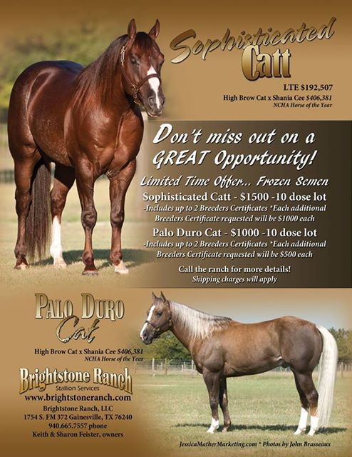 HIGH BROW CAT, Equi-Stat #1 Leading Cutting Sire. His offspring have earned over $60,000,000 including DONT LOOK TWICE ($820,224: 2011 NCHA Horse of the Year.), METALLIC CAT ($637,710: NCHA Horse of the Year; NCHA Open Futurity Champion), BOON SAN KITTY ($565,504: NCHA Co-Champion Horse of the Year; 2-time NCHA Open Classic/ Challenge Champion; PCCHA Open Stakes Champion; Breeders' Invitational Open Derby Reserve Champion).