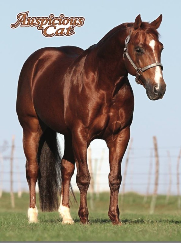 AUSPICIOUS CAT is the earner of nearly $330,158 & 66.5 AQHA points: NCHA Hall of Fame; 2012 & 2014 NCHA World Champion Stallion; 2012 NCHA Open Reserve World Champion; 2009 AQHA Reserve World Champion Junior Cutting; 5th, 2012 NCHA Open Finals; 2013 Augusta Cutting W-Series Open Champion; 3rd, 2013 ID CHA W-Series Open Cutting; 4th, 2013 El Rancho Cutting W-Series Open; 2012 NCHA Finals Senior Youth Champion; top 10, 2009 NCHA Open Derby; top 10, 2009 Breeders Invitational $10,000 Limited Open; finalist, 2009 Breeders Invitational Open Derby; 2014 ID CHA W-Series Open Reserve Champion; 2014 PCCHA Summer Derby W-Series Open Champion; 3rd, 2014 AQHA World Show Senior Cutting; 4th, 2014 NCHA Open Finals; 2010 Abilene Spectacular Open Classic, 2011 West TX Open Classic; 2009 Tunica 4-Year-Old Open Futurity, 2009 West Texas Open Derby, 2011 Chisholm Trail CHA Fall Open Classic; 4th, 2012 Congress WSeries Open Cutting; Superior Cutting.