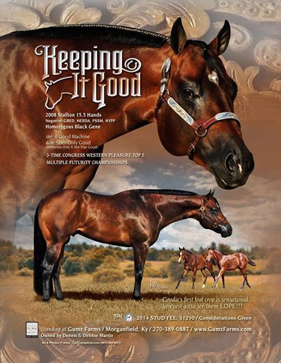 Keeping It Good - 5th Congress 2 YO Open Masters Western Pleasure Futurity Tom Powers 3 YO Open Western Pleasure Futurity Reserve Champion Lifetime Earnings: $19,461 Show Record: Performance Points: 26.5, NSBA: $19,060, Open Performance ROM 2010 5th Congress 2 YO Open Masters Western Pleasure Futurity 2010 12th World Show 2 YO Western Pleasure 2011 Tom Powers 3 YO Open Western Pleasure Futurity Reserve Champion 2011 VA QHA NSBA 3 YO Open Western Pleasure Classic Reserve Champion 2011 3rd Southern Belle NSBA 3 YO Open Western Pleasure 2011 4th NSBA World Show 3 YO Open Western Pleasure 2011 4/5 Southern Belle NSBA BDRS’ 3 YO Open Western Pleasure Sire Award 2011 5th Congress 3 YO Open Western Pleasure Derby 2011 8th Congress AQHA Jr. Western Pleasure 2012 Flag City AM Extra NSBA J1, J2 & J4 Jr. Western Pleasure Champion 2012 5th NSBA BDRS’ Championships 4-6 YO Open Western Pleasure 2012 8th NSBA World Show Jr. Western Pleasure